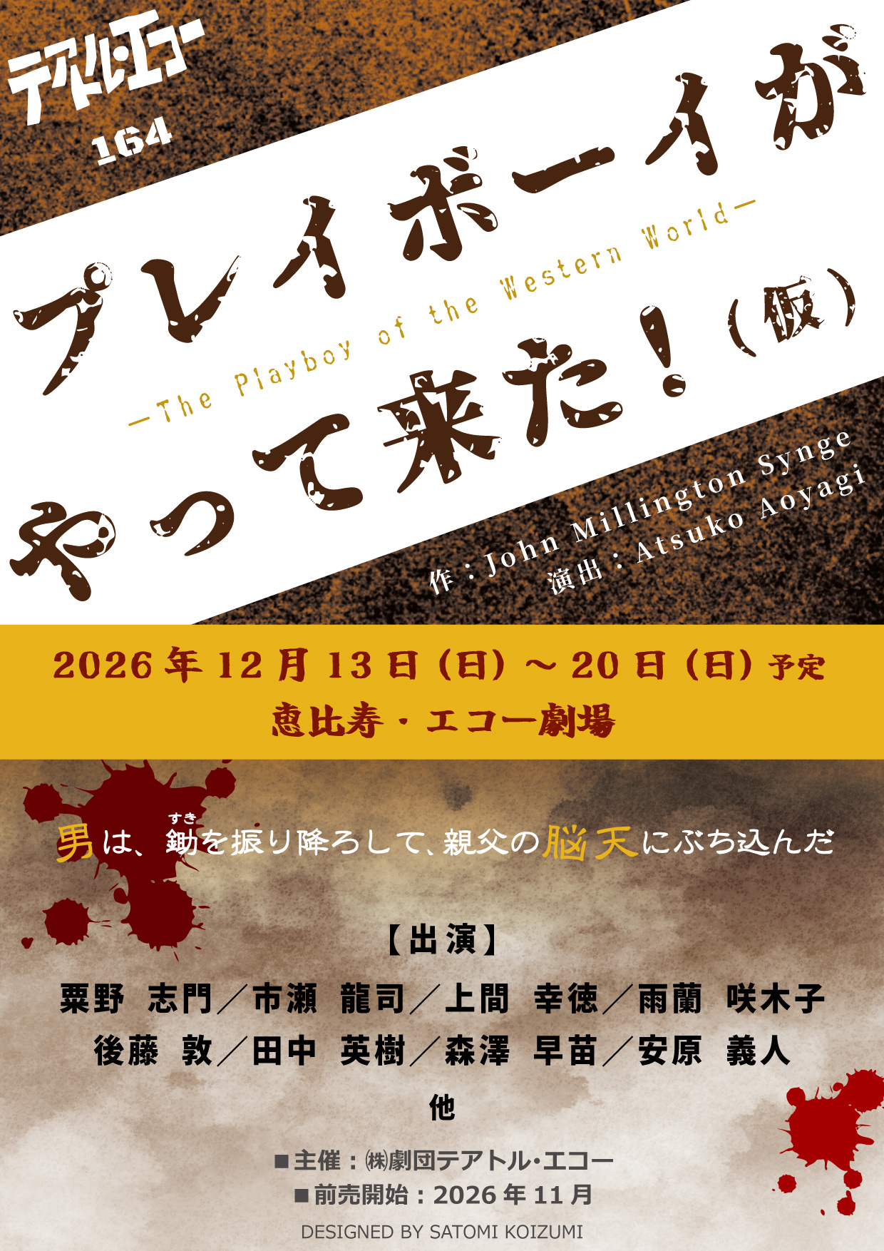 1907年の初演時、途中で退席する観客も出るほど賛否の別れたジョン・ミリントン・シングの問題作。「西の国の伊達男」という邦題で日本でも上演されました。今回、翻訳を一新し、119年後の現代日本にも通じる皮肉な笑いにテアトル・エコーが挑みます。