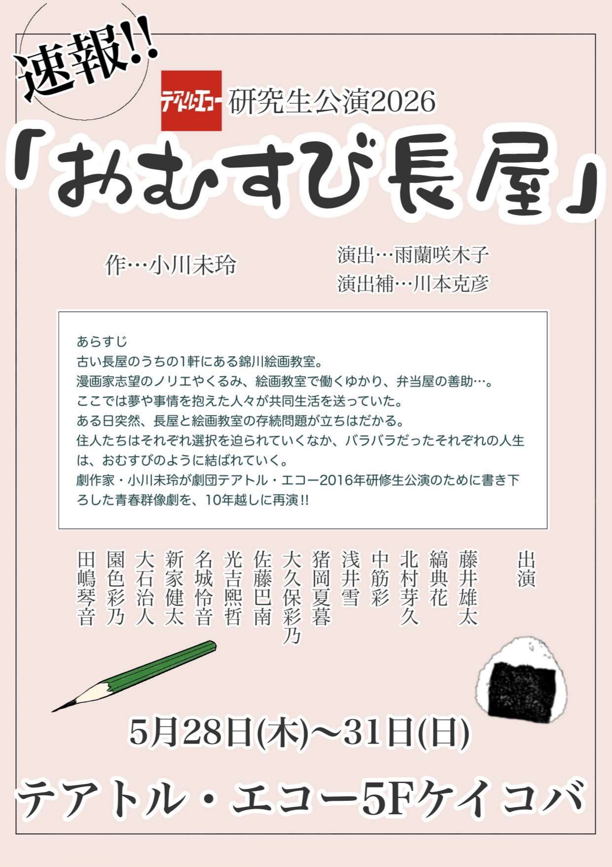 「お勝手の姫」「もやしの唄」等、エコーに数々の作品を提供して下さっている作家・小川未玲さん。実は養成所の卒業公演にもオリジナル戯曲を2つ書き下ろして頂いています。そのうちの1本を9年ぶりに、劇団研究生公演として再演します!